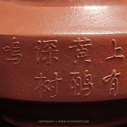 แกะสลัก : | (ลายนูนรอบใบ) ลวดลายบนป้านเป็นลายนกขมิ้นเกาะกิ่งไม้ พร้อมด้วยอักษรจีนข้อความว่า "独怜幽草涧边生 上有黄鹂深树鸣" ซึ่งเป็นท่อนหนึ่งจากบทกวี 山居秋暝 (ซานจวีชิวหมิง) ที่แต่งโดย 王维 (หวังเหวย) กวีเอกยุคถัง สามารถถอดความได้ดังนี้... ------------------------------------------------ เสี้ยวสงสารหญ้าเงียบเหงาที่ขึ้นอยู่ริมธาร เบื้องบนก็มีนกขมิ้นร้องเพลงอยู่ในร่มไม้ลึก ------------------------------------------------ วรรคนี้สะท้อนถึงความเงียบสงบของธรรมชาติในฤดูใบไม้ร่วง ผู้แต่งรู้สึกเอ็นดูหญ้าต้นเล็ก ๆ ที่เติบโตเงียบ ๆ อยู่ริมธาร ขณะที่เสียงนกร้องในพงไม้ก็แสดงให้เห็นถึงชีวิตที่ยังคงเคลื่อนไหวอย่างอ่อนโยนภายใต้ความสงบ |
