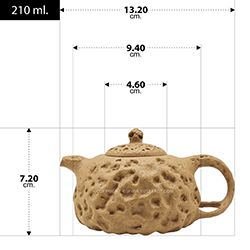 ขนาด : | A : ความยาว (ปลายพวย-ปลายหูจับ) = 13.20 เซนติเมตร B : ความกว้าง ตัวป้าน = 9.40 เซนติเมตร C : ความกว้าง ฝาป้าน = 4.60 เซนติเมตร D : ความสูง (ก้นป้าน-ปลายดุม) = 7.20 เซนติเมตร |