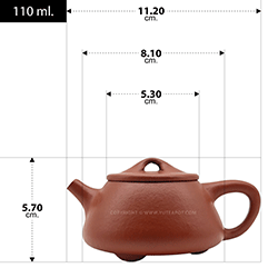 ขนาด : | A : ความยาว (ปลายพวย-ปลายหูจับ) = 11.20 เซนติเมตร B : ความกว้าง ตัวป้าน = 8.10 เซนติเมตร C : ความกว้าง ฝาป้าน = 5.30 เซนติเมตร D : ความสูง (ก้นป้าน-ปลายดุม) = 5.70 เซนติเมตร |