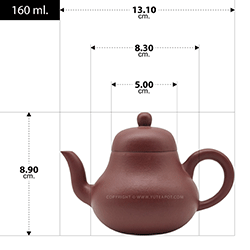 ขนาด : | A : ความยาว (ปลายพวย-ปลายหูจับ) = 13.10 เซนติเมตร B : ความกว้าง ตัวป้าน = 8.30 เซนติเมตร C : ความกว้าง ฝาป้าน = 5.00 เซนติเมตร D : ความสูง (ก้นป้าน-ปลายดุม) = 8.90 เซนติเมตร |