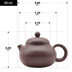 ขนาด : | A : ความยาว (ปลายพวย-ปลายหูจับ) = 9.80 เซนติเมตร B : ความกว้าง ตัวป้าน = 7.30 เซนติเมตร C : ความกว้าง ฝาป้าน = 4.70 เซนติเมตร D : ความสูง (ก้นป้าน-ปลายดุม) = 6.50 เซนติเมตร |